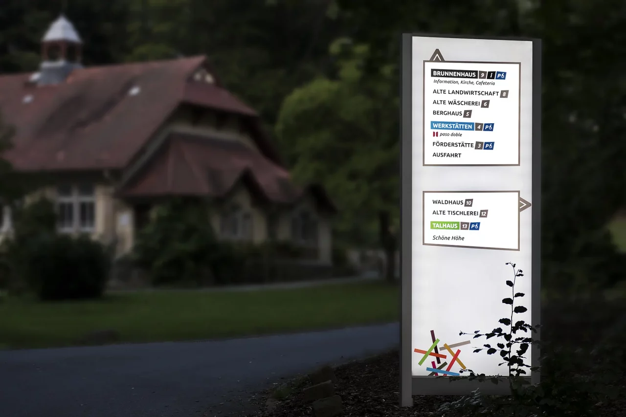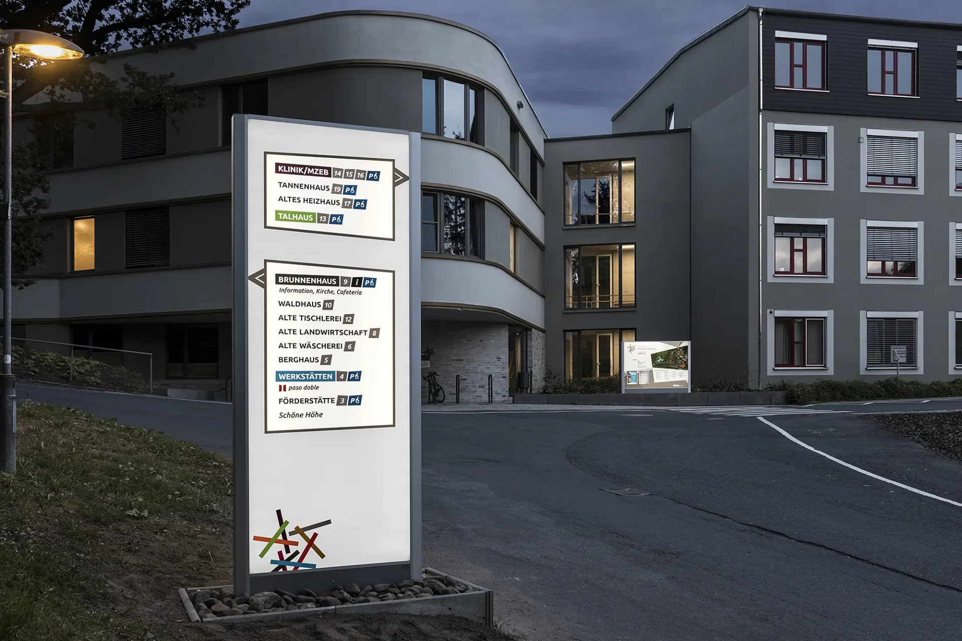 Abendaufnahmen von Elementen des Leit- und Infosystems